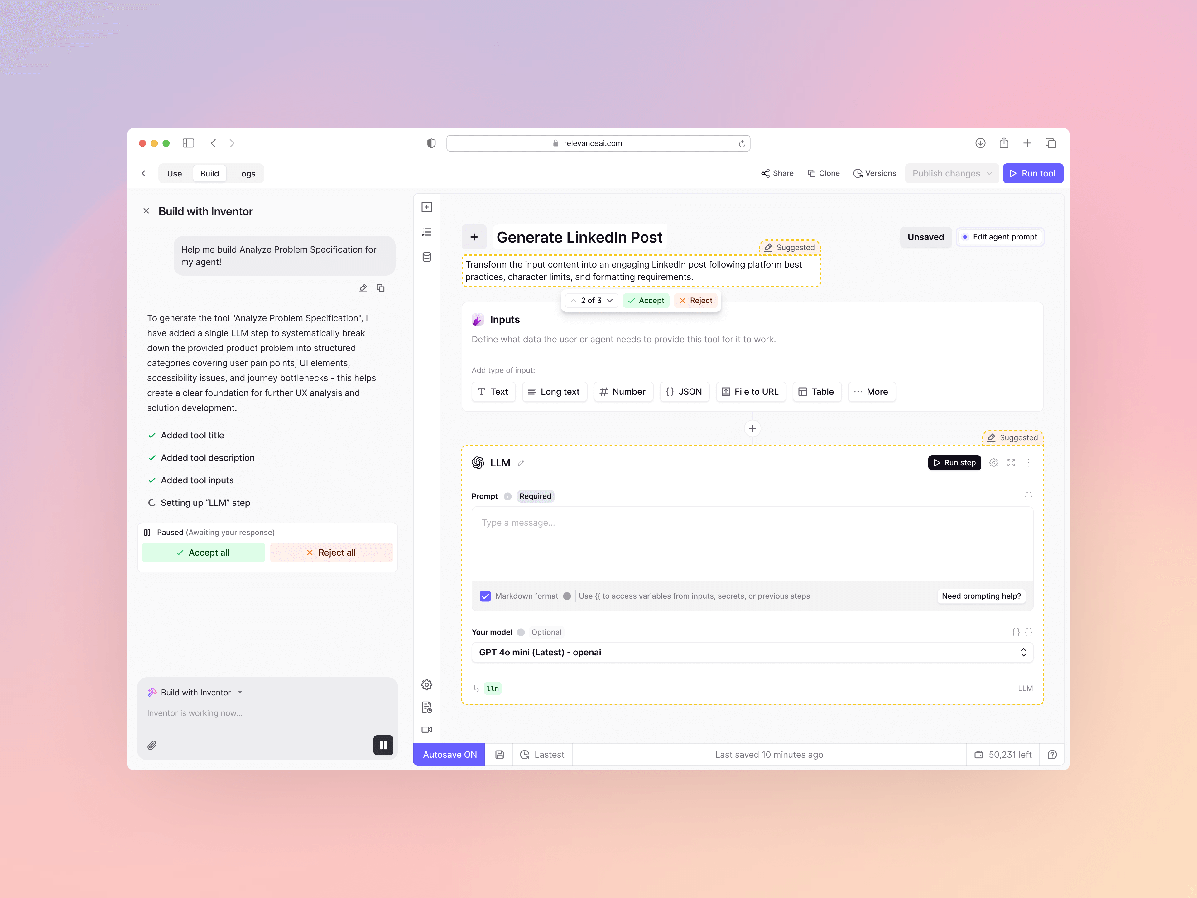 Balancing customisability and a huge range of features for power-users with natural UX and clear communication of these features. The users of the Relevance AI builder platform range from AI-native power-users, enterprises, right down to solo users creating agents to assist with their everyday lives, so designs needed to cater to this broad range while not limiting any of the functionality under the hood.